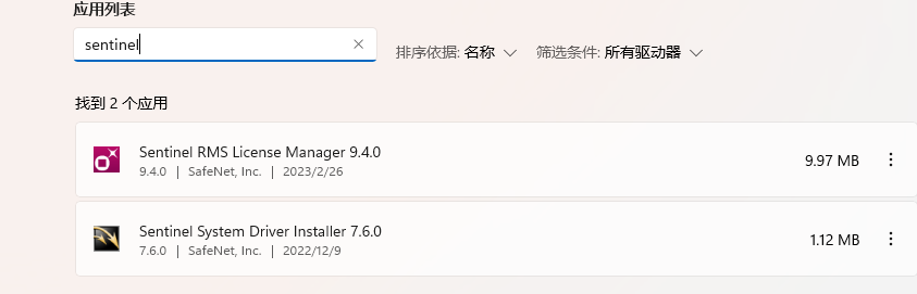 3、安裝前需要先卸載之前安裝過(guò)的驅(qū)動(dòng)程序??梢栽陔娔X的應(yīng)用列表中搜索sentinel,找到驅(qū)動(dòng)程序進(jìn)行卸載。(如圖4-3)