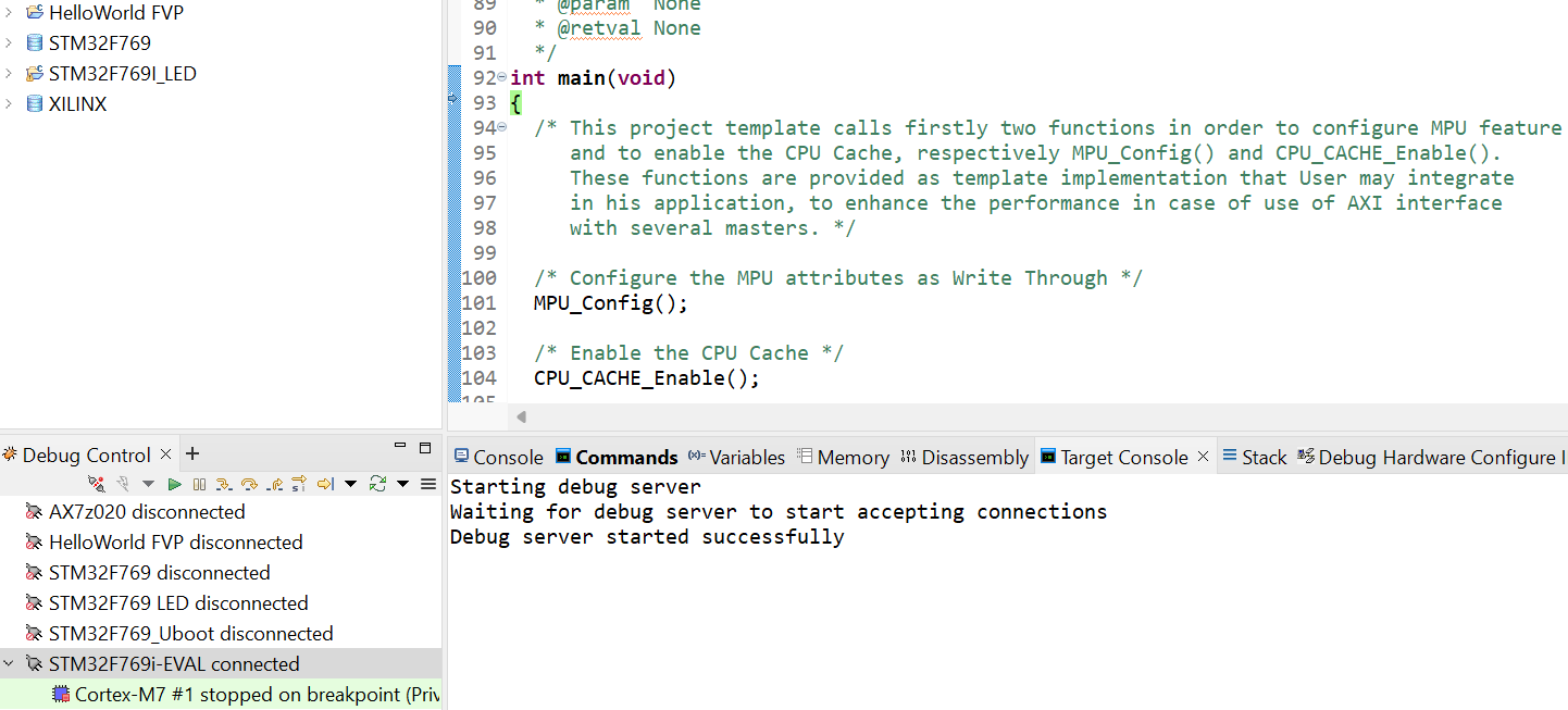 3)、然后, ARMDS中就可以看到連接成功了(如圖4-3-1)。并且可以成功調試(如圖4-3-2)