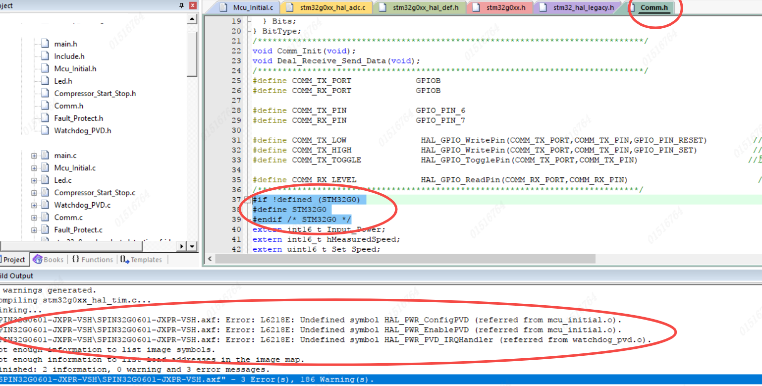 定義在STM32G0xx .h中的函數,它總是包含在基于STM32G0xx設備的項目中并使用。將STM32G0xx .h修改部分還原,并且將其文件格式設置為可讀即可,如圖4-1在Comm.h文件并進行宏定義,而后編譯出現錯誤,符合檢查動態語法規則。