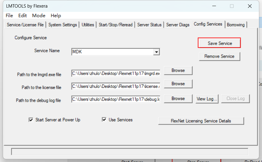 3)、進(jìn)入服務(wù)管理程序存放的文件夾,雙擊打開<lmtools.exe>,首先停止服務(wù),再保存一次,讀取"armld.opt"內(nèi)數(shù)據(jù),然后再次重啟該服務(wù)。