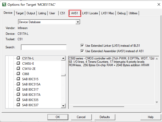 1)、在Options->Device窗口中,可以找到“Use Extended Linker (LX51) instead of BL51”的勾選項(xiàng)。選擇后,鏈接器的使用選項(xiàng)就會(huì)變成LX51(如圖4-1)。