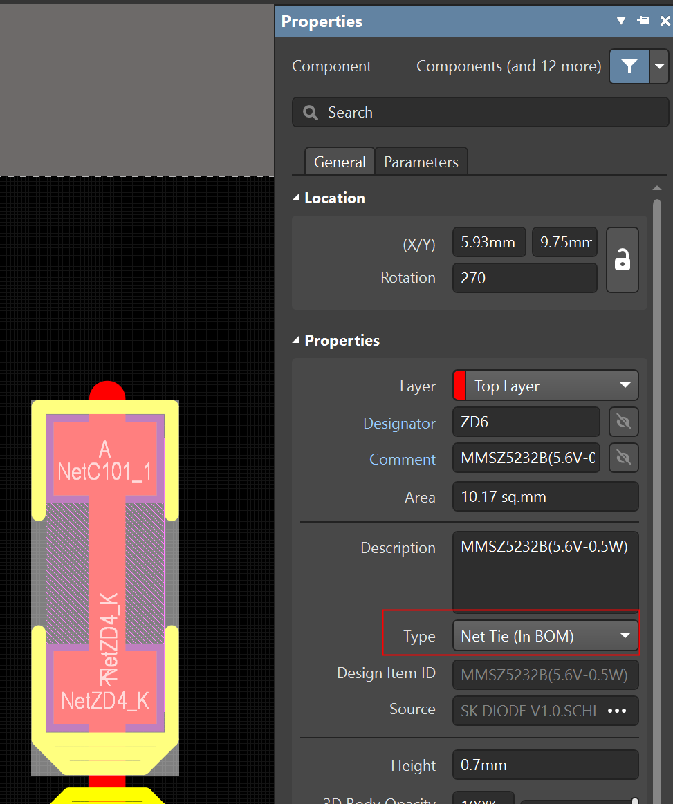 創建元件庫時,需要選擇元件類型,默認標準元件都是Standard,當元件類型錯誤選擇了Net Tie之后,對PCB布線會產生影響,Net Tie不同于Standard,將一個元件的類型設置為Net Tie之后,該元件將可以作為跳線使用,不同網絡的焊盤與焊盤之間可以進行連接,并且DRC不會報錯,如圖2。