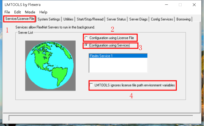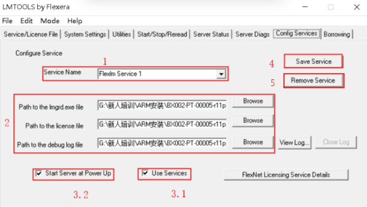 如圖4-4所示,標(biāo)記1:處列出許可證服務(wù)器計(jì)算機(jī)上的所有?FlexNet 許可證服務(wù)。