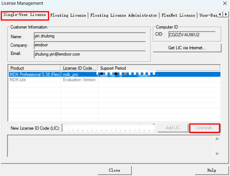 2)、將郵件的列表中一臺許可計算機進行卸載授權,首先進入uVsion IDE中打開“File”-“license Management”,進入 “Single-User license”目標欄,選中所需卸載授權,單擊“Uninstall...”然后在提示符中選擇“Yes”。