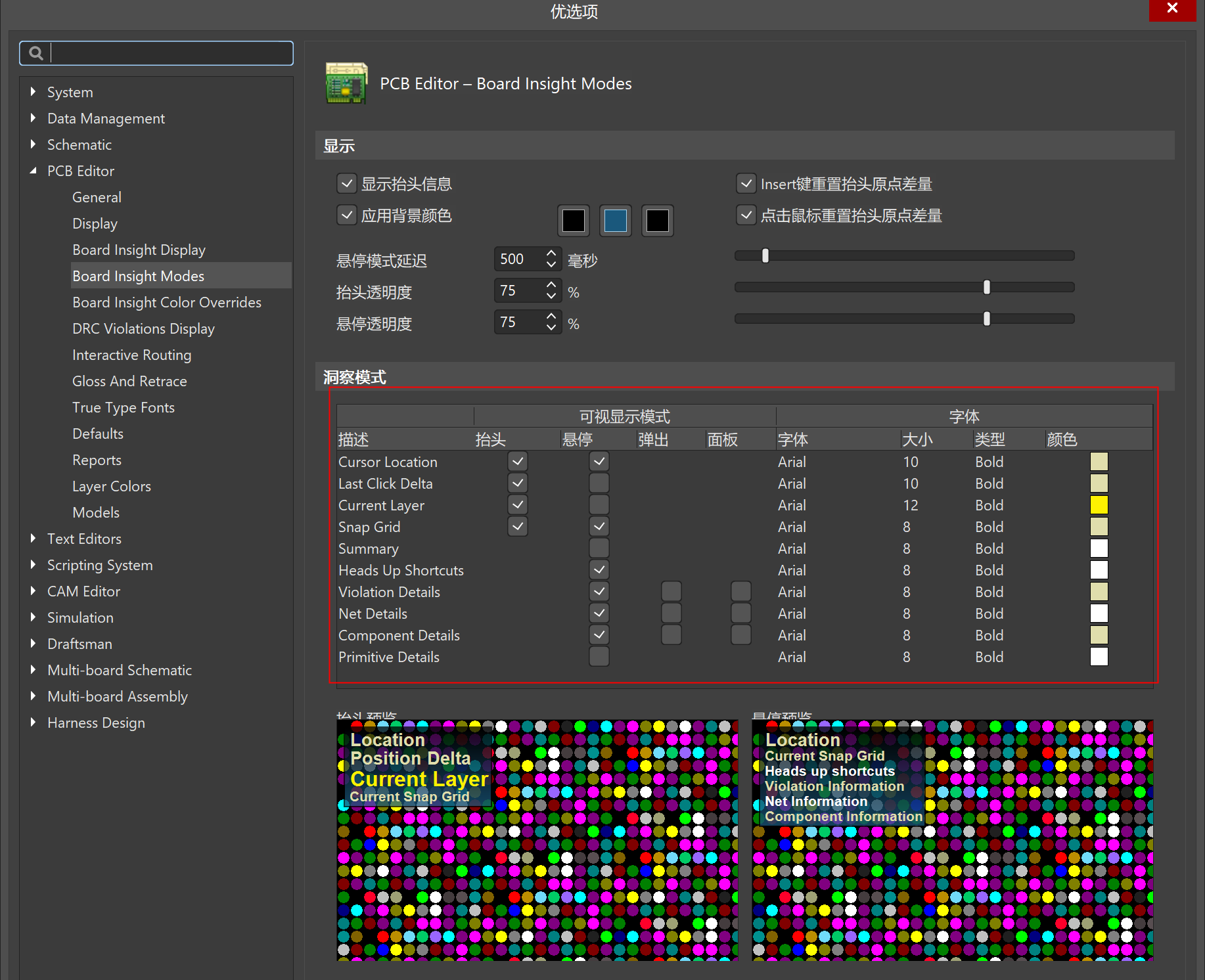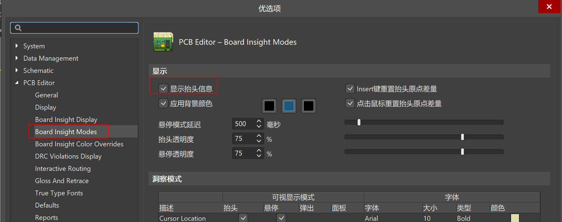 1)、在優選項設置中,找到PCB Editor-Board Insight Modes,通過勾選/取消勾選“顯示抬頭信息”可以將抬頭顯示懸浮窗口設置為顯示或隱藏。也可以直接使用快捷鍵"Shift+H"來實現。