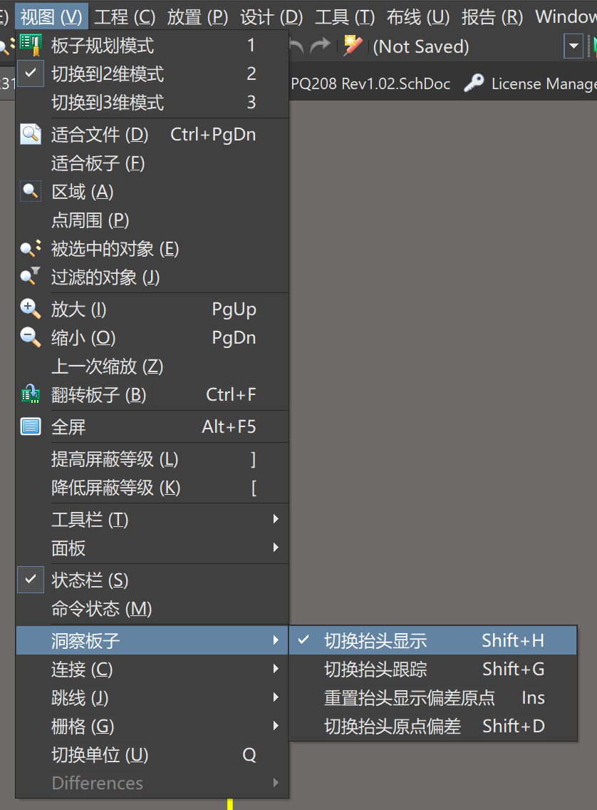 3)、打開菜單中的視圖-洞察板子,也可以看到針對抬頭顯示懸浮窗口設置的快捷鍵,“重置抬頭顯示偏差原點”和“切換抬頭原點偏差”這兩項在設計中一般用不著。