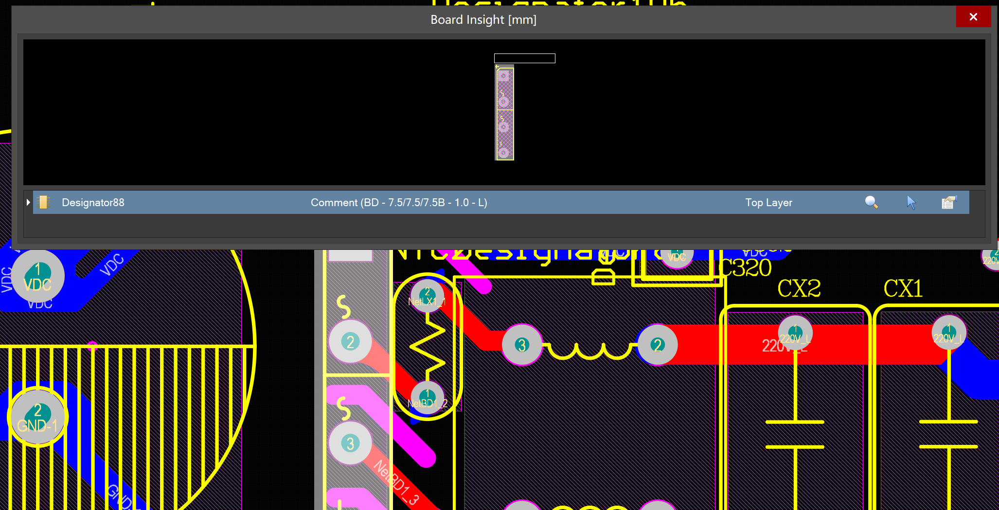 4)、在優選項設置的PCB Editor-Board Insight Modes中,通過更改“洞察模式“中打勾的選項,可以調整抬頭顯示懸浮窗口顯示的信息。此處有個小技巧,勾選了“Net Details”和“Component Details”,在PCB上選擇某個對象時,按快捷鍵"Shift+X"可以打開其Detail窗口,如圖5所示,通過此窗口可以對其進行放大、選中、打開屬性窗口這三項操作。"Primitive Details"不建議勾選,勾選此處懸浮窗口會顯示鼠標懸停位置所有內容信息,導致顯示內容過多,影響視覺,見圖6.