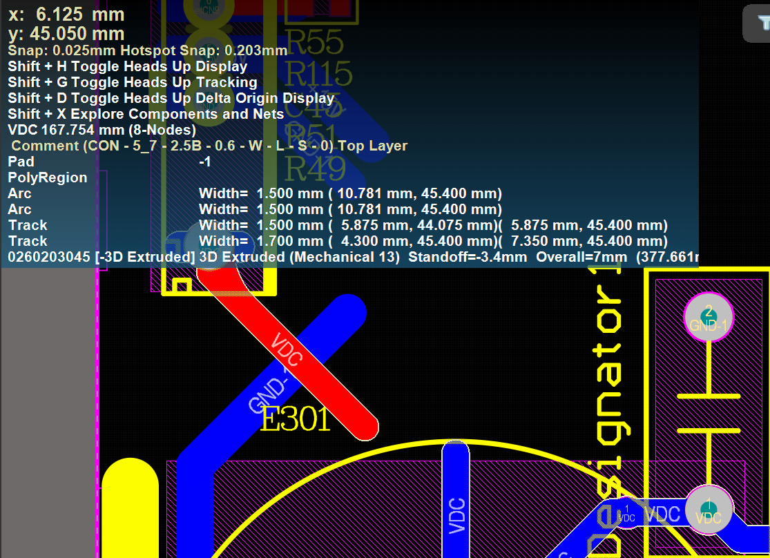 PCB設計界面中左上角有一個抬頭顯示懸浮窗口,這個窗口可以顯示坐標,選中PCB中某個對象后還能顯示它的具體信息。有用戶不喜歡這個窗口,也有用戶因為一些誤操作導致顯示的內容過多,如圖1,影響PCB設計,應該如何去設置?