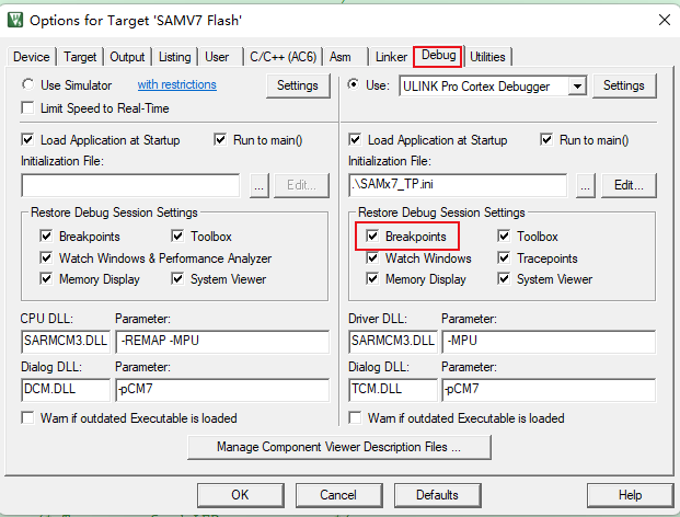 2)當(dāng)退出debug模式后,想要保留斷點(diǎn)不被清除,需要找到options->debug中的Restore Debug Session Settings處,勾選上Breakpoints(如圖4-2)。這樣再次進(jìn)入debug模式后斷點(diǎn)就不會(huì)清除了。