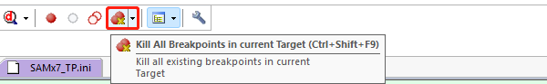 3)如果想要清除斷點(diǎn)的話,除了可以不勾選上面的選項(xiàng)外,可以點(diǎn)擊工具欄中的Kil All Breakpoints in current Target的按鈕去清除全部斷點(diǎn)。(如圖4-3)