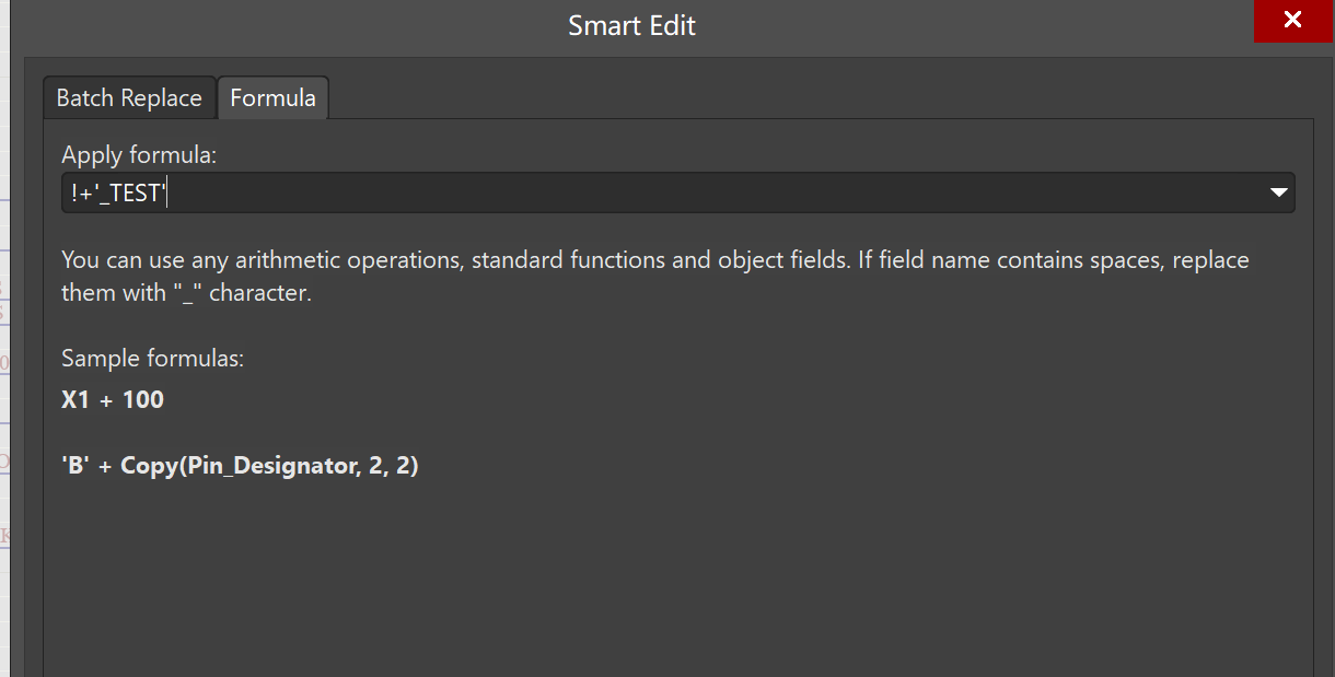 例如:給圖紙上所有的元器件位號加上“TEST"的后綴,可以這樣寫表達式:Name+'_TEST'或者!+'_TEST'。