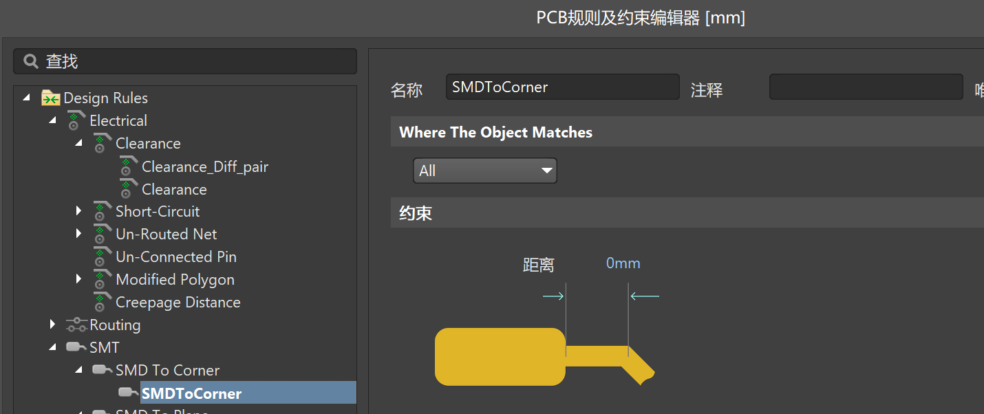 在PCB規則的SMT中,有一項SMD to Corner,按照圖示解釋,可以設置一段距離,具體是什么作用。