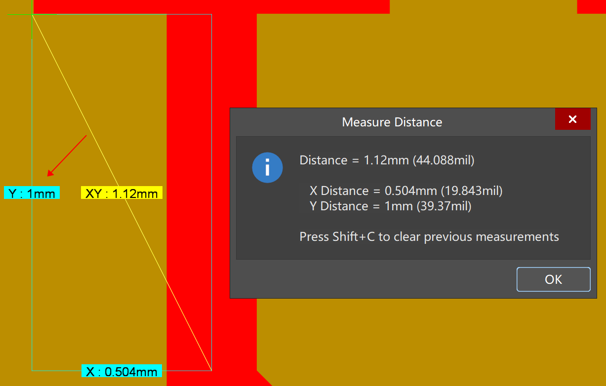 將規則中的距離進行更改,設置成1mm,再去進行拉線,此時發現,從焊盤引出導線后,在一定長度后才可以進行拐角操作,對引出的導線到拐角處的距離進行測量,長度為1mm,正是規則中設置的長度。