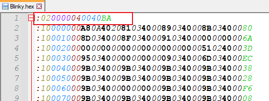 (1)、HEX文件的開頭第一行(如圖4-3-1):“:020000040040BA”