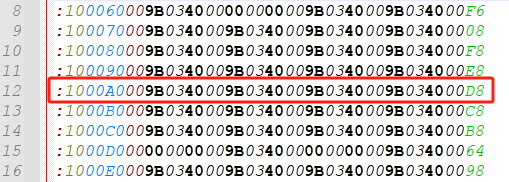 (2)、HEX文件的中間的數(shù)據(jù)行(如圖4-3-2):“:1000A0009B0340009B0340009B0340009B034000D8”