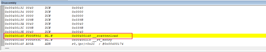 (e)、“00400141”:這里就表示線性起始地址。地址為0x00400141,是指令集執(zhí)行的起始地址,這個地址指向的是__scatterload函數(shù),該函數(shù)用于將程序代碼和數(shù)據(jù)從鏈接文件中加載到內(nèi)存中,是由編譯器提供的。(如圖4-3-3-1)
