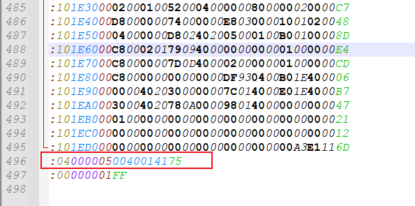 (4)、Hex文件的倒數(shù)第二行數(shù)據(jù)(如圖4-3-3-2):“:040000050040014175”