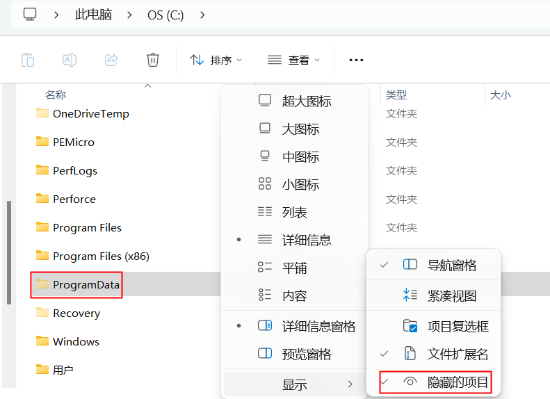 2)、進入C盤查看選擇<查看>--<隱藏的項目>,進入<ProgramDate>文件夾,