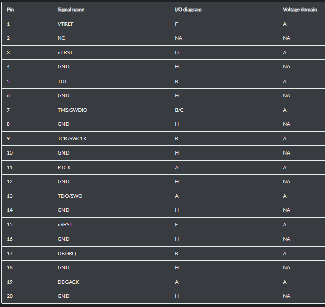 2)、標準的20 PIN CoreSight 接口的引腳定義,如圖4-2所示: