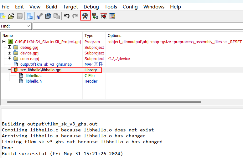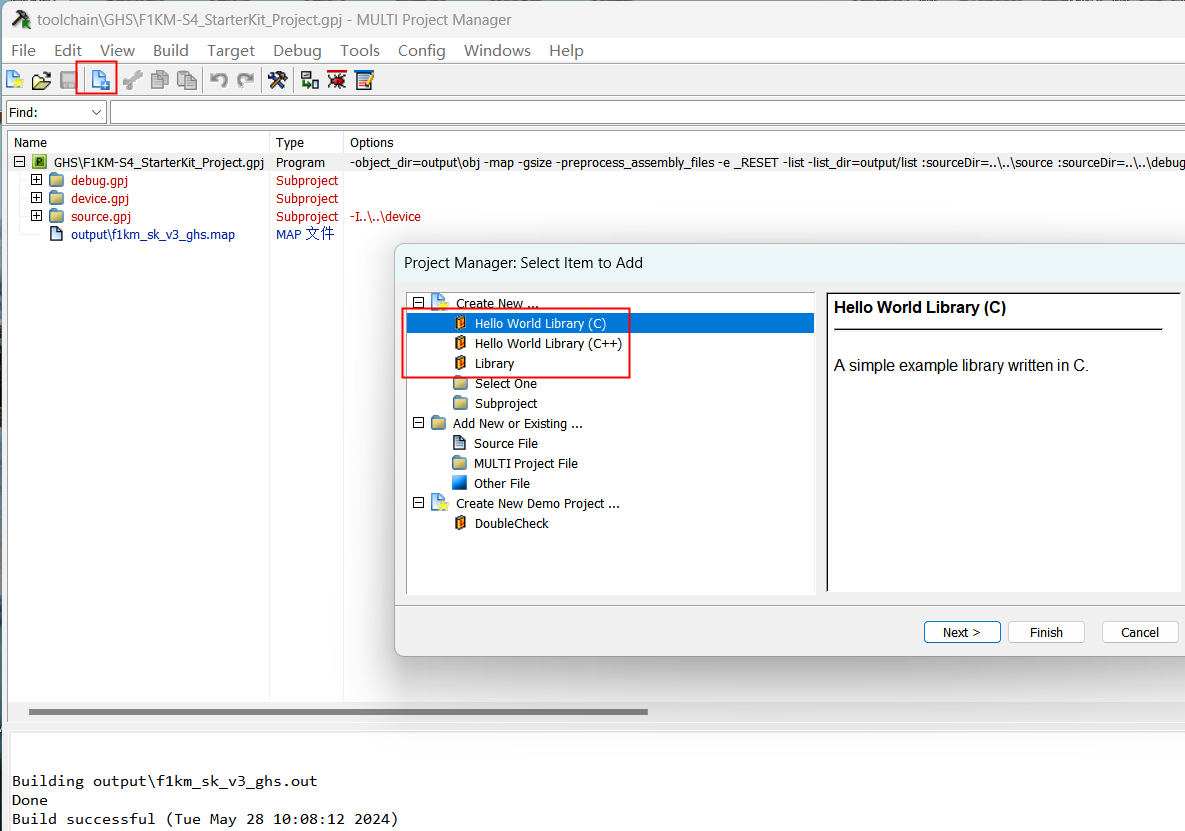 1)、本次采用工程為瑞薩官方例程、Y-ASK-RH850F1KM-S4-V3_sample_V101、打開項目工程,選擇項目編譯成功。點擊如圖添加文件快捷鍵、或者點擊"Edit"再點擊"Add ltem into F1KM-S4 Starterkit Project.gpj...",“Create New ...”內選擇與“Hello World LIbrary” 對應的C/C++語言或創建“Library”無示例工程。