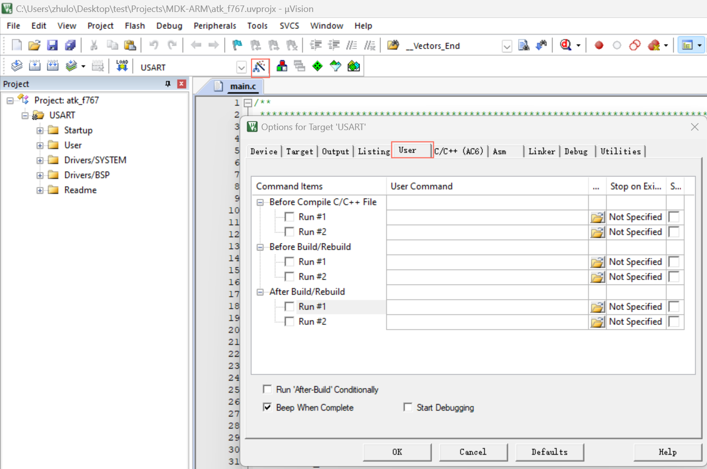 1)、首先打開keil軟件,本示例工程名稱為atk_f767,確保該工程可成功編譯后,點(diǎn)擊“魔法棒”進(jìn)入Options界面,選擇“User”進(jìn)入配置界面。