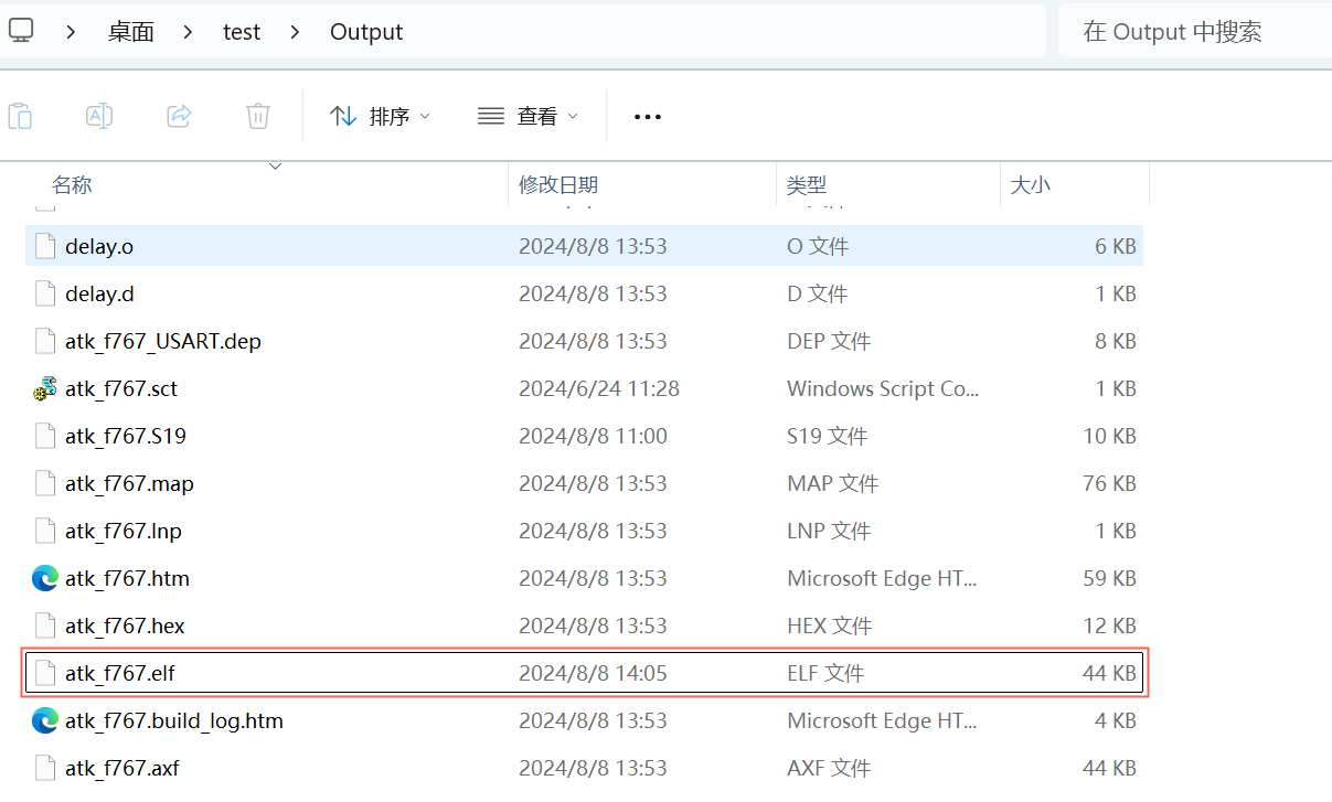 3)、點(diǎn)擊編譯后,在相應(yīng)的文件夾下生成atk_f767.elf文件。