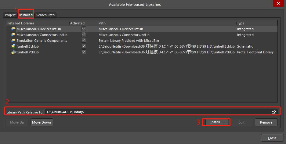 4 選擇 installed 標(biāo)簽,再選擇庫文件所在的目錄,最后確認(rèn)安裝庫文件。
