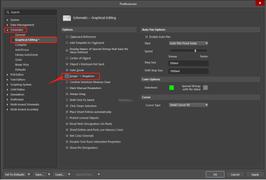 從Altium Designer 21版本開始,當在Preference界面下的Schematic-->Graphical Editing 選項卡中,勾選Single ’’ Negation 后。單擊Apply及OK完成設置。
