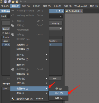 執行菜單欄中的“編輯”--> “設置參考”-->“1腳”/“中心”/“位置”,即可實現將參考點設置在封裝的1腳、中心以及任意位置。