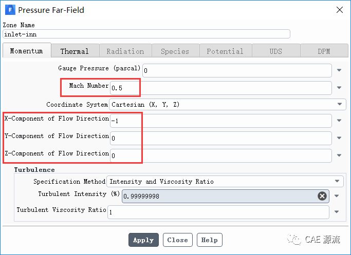 5.邊界條件入口邊界采用壓力遠場邊界,速度為0.5個馬赫數(shù),即子彈出膛后的速度為0.5個馬赫數(shù),之后在風阻的作用下速度開始減小。