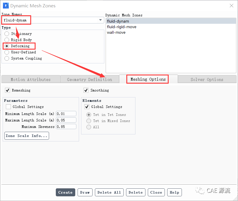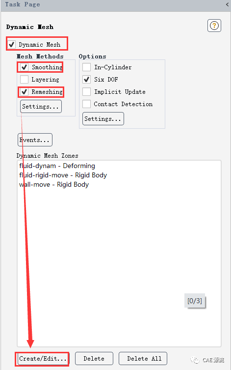 進入Dynamic Mesh面板,勾選Smoothing和Remeshing并打開Six DOF模型,然后進行動網(wǎng)格區(qū)域的定義