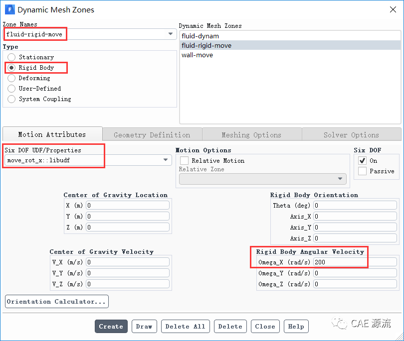 fluid-rigid-move設(shè)置為剛體,運動方式采用UDF定義,旋轉(zhuǎn)速度如下圖:
