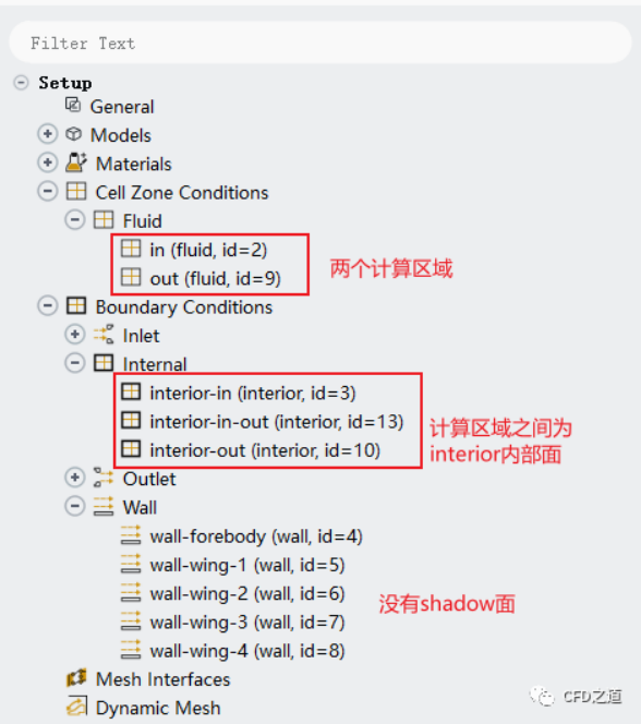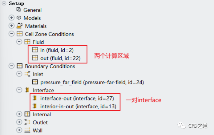 讀取完畢后計(jì)算區(qū)域與邊界如下圖所示。此時(shí)有2個(gè)計(jì)算區(qū)域,還有2個(gè)interface邊界。