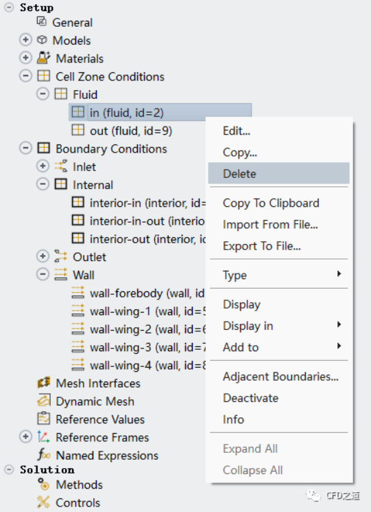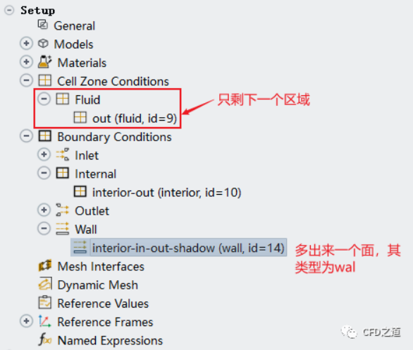 刪除完畢后計(jì)算區(qū)域中只剩下out區(qū)域,且原來(lái)的內(nèi)部面自動(dòng)修改為wall類型的邊界,如下圖所示。