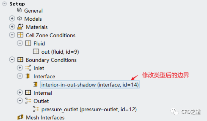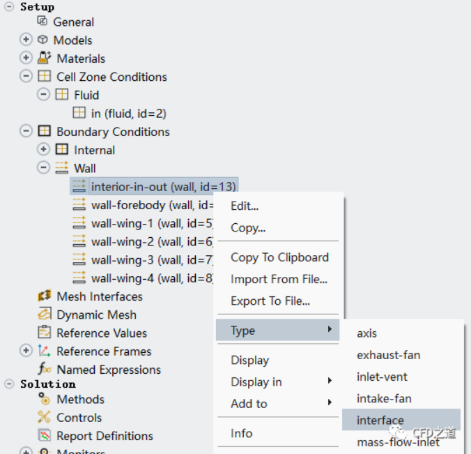 修改上面自動(dòng)轉(zhuǎn)化成的wall邊界的類型,將其修改為interface類型,如下圖所示操作
