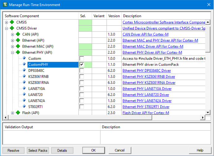 示例軟件包將名為CustomPHY 的軟件組件添加 到CMSIS Driver類的子類以太網 PHY (API)。通過勾選復選框Sel ,可以使用Run-Time-Environment窗口將軟件組件添加到項目中: