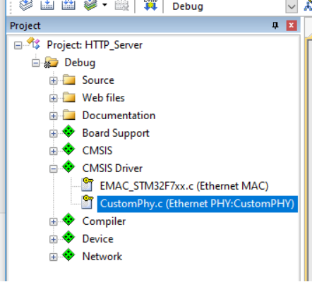 在我們的示例中,CustomPack 提供以太網 PHY 實現,因此選擇 CustomPHY 組件會將文件 CustomPHY.c添加到項目窗口中的軟件組件類CMSIS Driver。