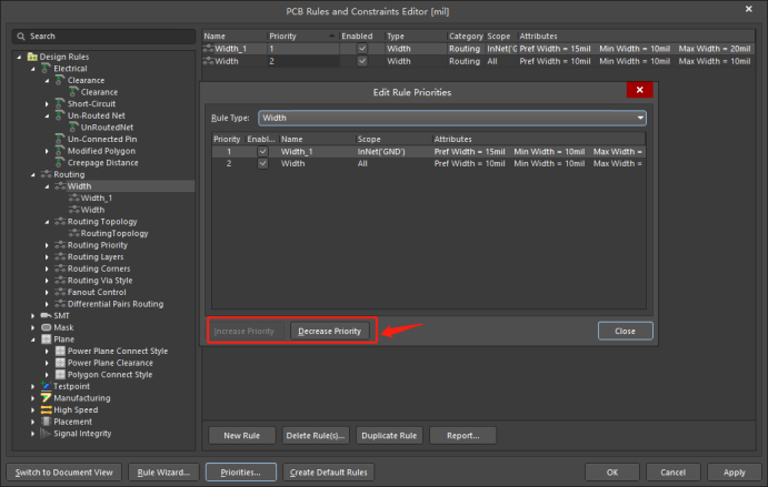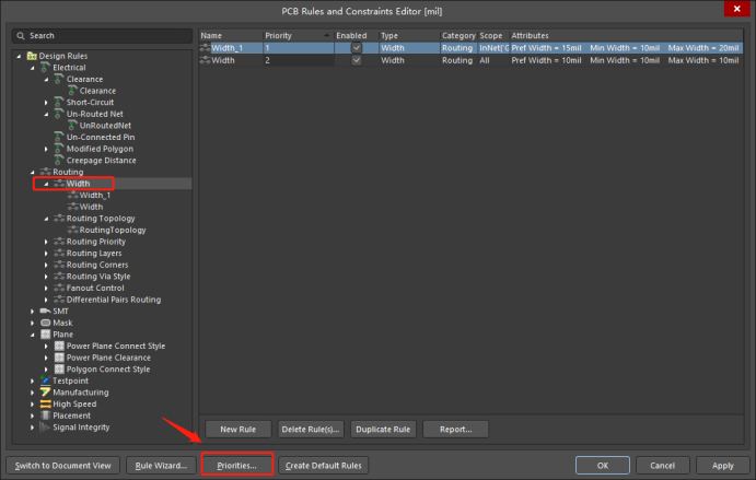 選擇有多條約束的規則,例如線寬; 點擊下方Priorities...(優先級)