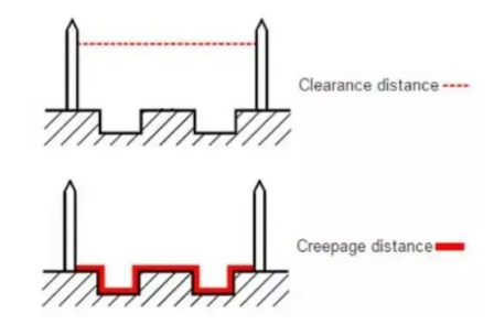 爬電距離:沿著絕緣材料表面測量的兩個導電對象之間或導電對象與設備防護界面之間的最短路徑。