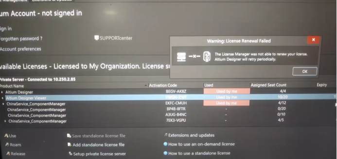 問題1:License顯示“Used by me”,彈出如下提示框,并且該License無法使用。