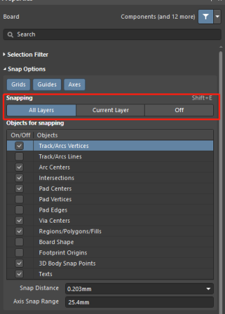 用于切換設(shè)計對象的捕捉啟用方式,All Layers(所有層)Current Layer(僅當前層)Off(關(guān)閉捕捉),也可以通過Shift+E切換;