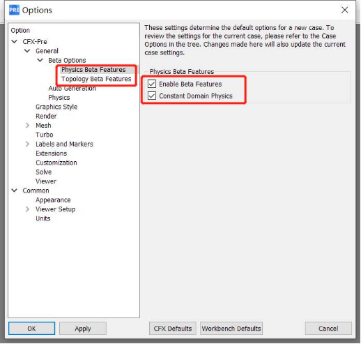 在CFX-Pre界面下,菜單欄選擇Edit->Options。在Options窗口選擇 CFX-Pre->General->Beta Options. 然后勾選需要的Beta功能,如下圖所示。