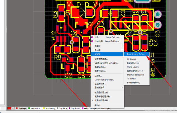 右鍵單擊下面層的選項卡。如圖“層設定”->"Board Layer Sets"