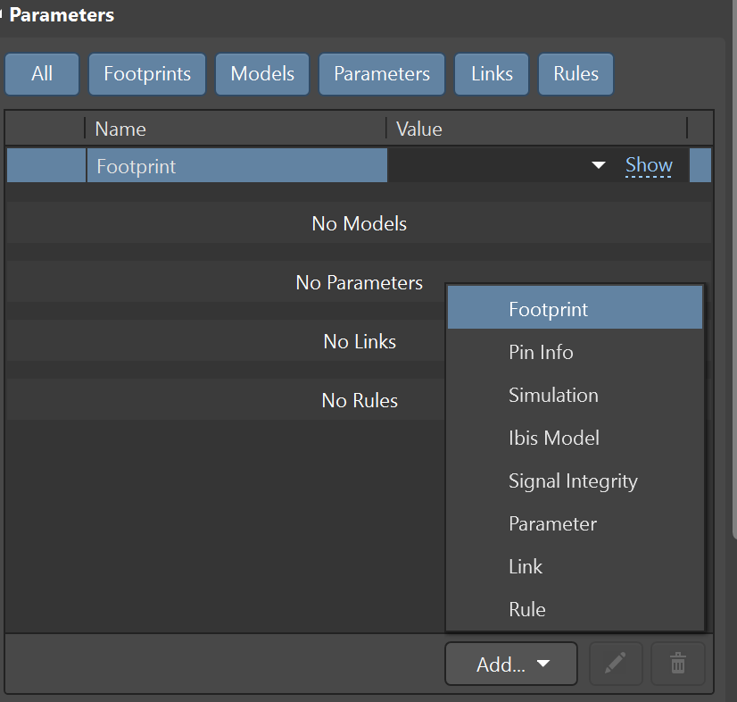 2. 在屬性面板的“Parameter”下選中“Footprint”,點擊【Add】按鈕,選擇“Footprint”,打開PCB模型窗口