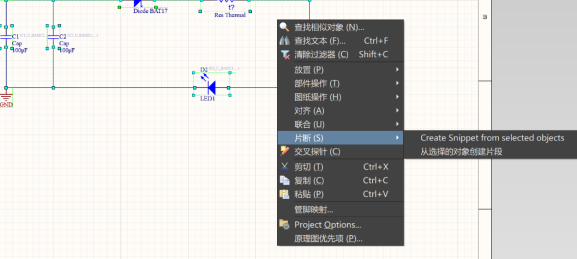 在確定好保存文件夾后,關(guān)閉該對(duì)話框,在原理圖中選中想要摘錄出來(lái)的部分電路,然后鼠標(biāo)右鍵,選擇【片段】,會(huì)出現(xiàn)兩條指令(Create Snippet from selected objects和從選擇的對(duì)象創(chuàng)建片段),實(shí)測(cè)下來(lái),兩跳指令除了打開(kāi)的對(duì)話框不同之外,實(shí)現(xiàn)的功能是相同的。