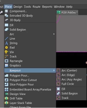 1. 先切換到Keep-Out層,執行菜單中的“放置”——“Keepout”——(選擇放置的形狀或線徑),即可正常放置Keepout線,放置后可以對其所在層進行更改以決定該Keep-out對那個層有效。