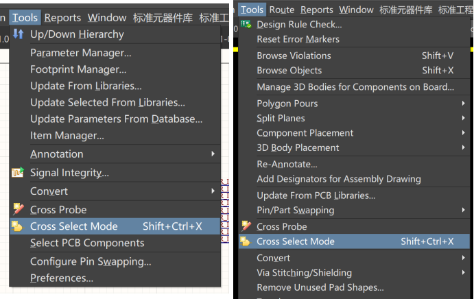 1. 打開交叉選擇模式,需要在原理圖界面和PCB界面執(zhí)行菜單Tools——Cross Select Mode,打開交叉選擇模式功能。