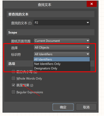 這里就需要對查找的設(shè)置做一下改變,如下圖所示,在“選擇”下拉框中選定”All Objects”,這樣就不用選定任何對象即可在當前原理圖中進行查找。在“標識符”下拉框中可以選擇查找所有標識符、網(wǎng)絡(luò)標識符、僅位號,再將“跳至結(jié)果”勾上,會自動跳轉(zhuǎn)到查找到的對象。這樣再去進行查找,就可以找到所需對象。