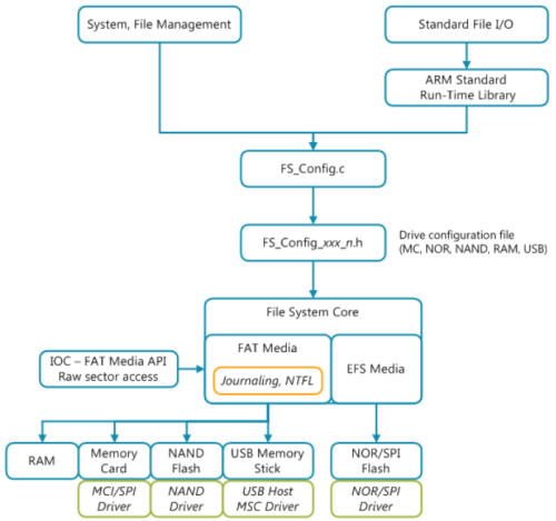 FAT、EFS Media: FAT文件系統支持MC (Memory card)、NAND Flash、u盤和RAM盤。嵌入式文件系統(EFS)支持NOR Flash設備。