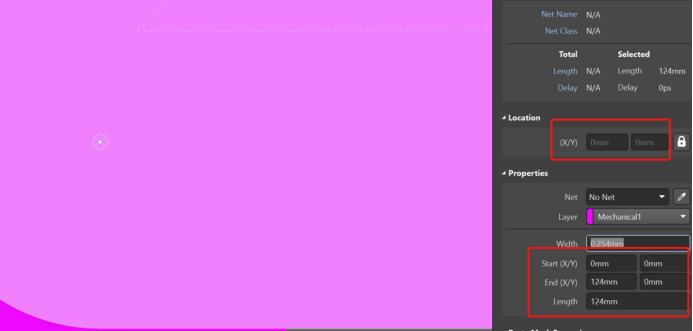 3. 在需要設置原點的位置,將PCB放大. 選取橫向的那條線,顯示出線左邊的端點(即需要設置成原點的那個點)